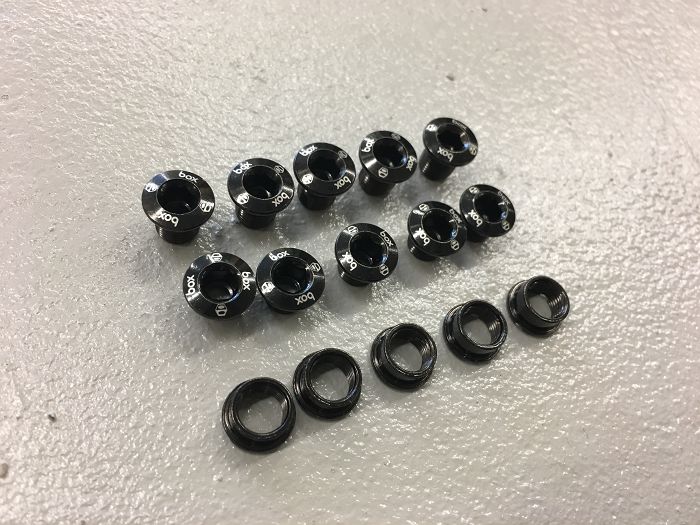 BOXのレーサー用クロモリ チェーンリング ボルトです。8.5mmフロントボルト 5本、6mmフロントボルト 5本、4mmリアナット 5個 がセットになっており、様々なクランクとチェーンリングの組み合わせに対応します。